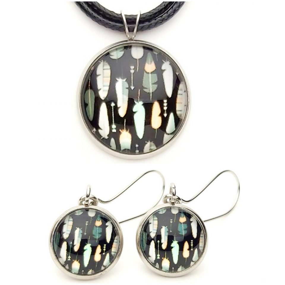 Az üveglencsés ékszer szett 20mm-es üveglencsés medálból, a hozzá illő 16mm-es üveglencsés fülbevalóból valamint az ékszer színeivel harmonizáló textil nyakláncból áll. A lánc 1,5 mm vastag, viaszolt szálból készült, 50cm hosszú,dupla szálas. Az ékszer minden fém kiegészítője rozsdamentes acél.
